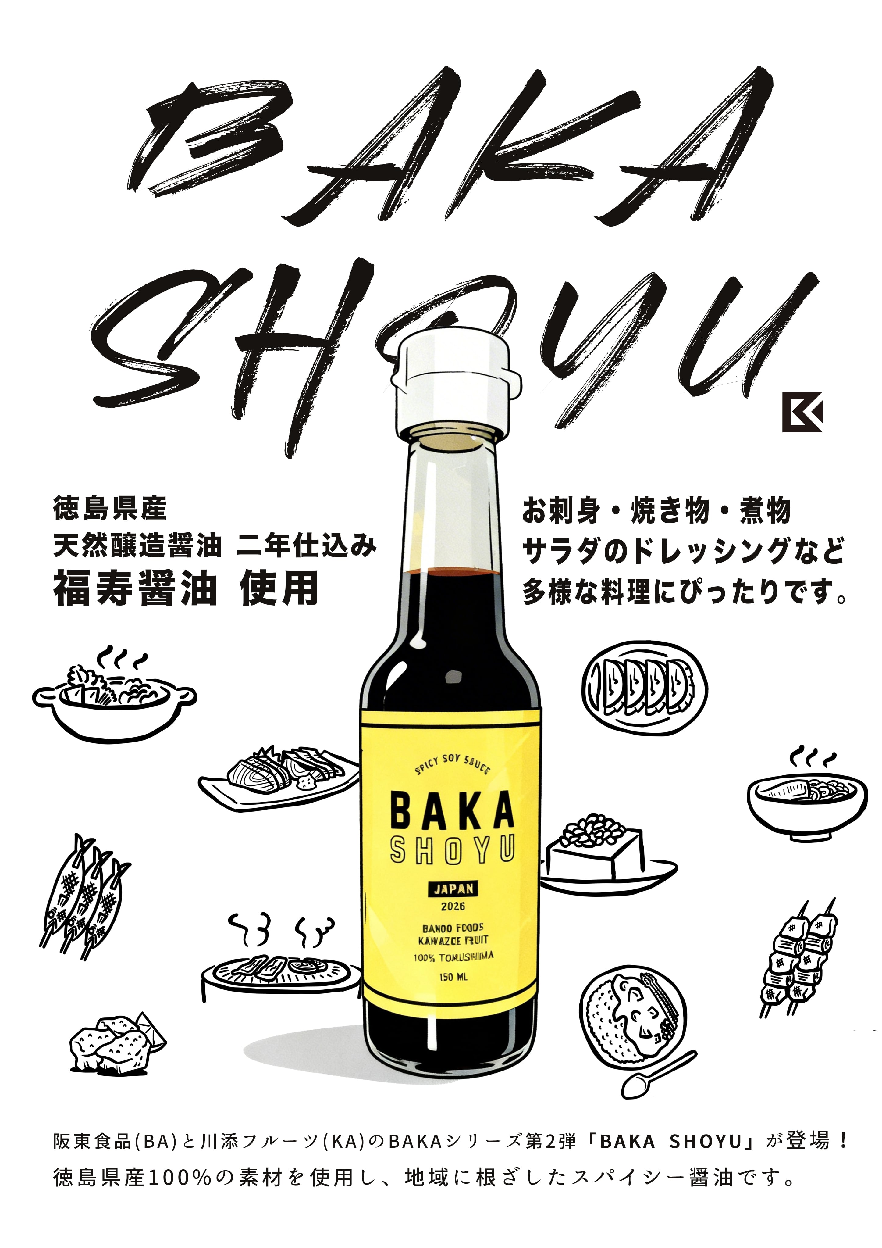 阪東食品(BA)と川添フルーツ(KA)のBAKAシリーズ第2弾「BAKA SHOYU」が登場。徳島県産100%の素材を使用し、地域に根ざしたスパイシー醤油です。お刺身や焼き物、煮物、サラダのドレッシングなど多様な料理にぴったりです。